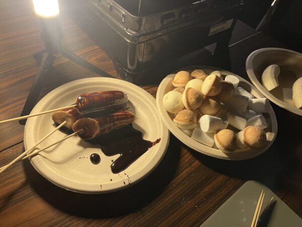 広場(遊歩道)では、温かい飲み物やスープ、チョコフォンデュなどのお食事をご用意し、パーティー形式で楽しんでいただきました。